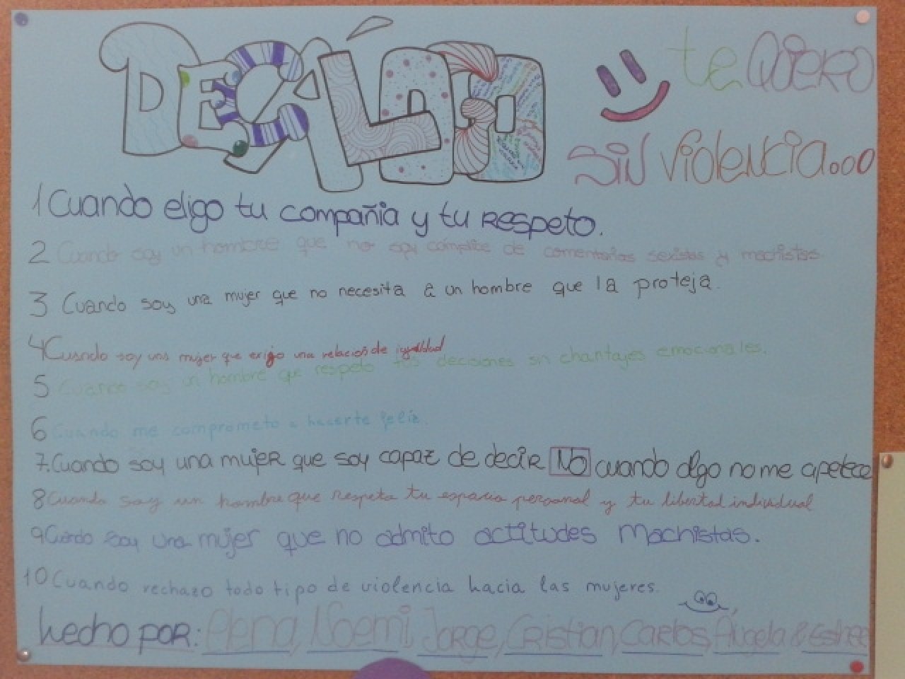 Además de todas las actividades que se han desarrollado en el IES Al-Zujáyr para la celebración del Día Internacional contra la Violencia de Género del pasado día 25N, el alumnado de 3º de Diversificación ha propuesto un Decálogo donde se recogen formas de relación basadas en la igualdad, el respeto, la autonomía personal y el apoyo mutuo, y que son importantes tenerlas en cuenta en las relaciones de pareja entre los jóvenes.
