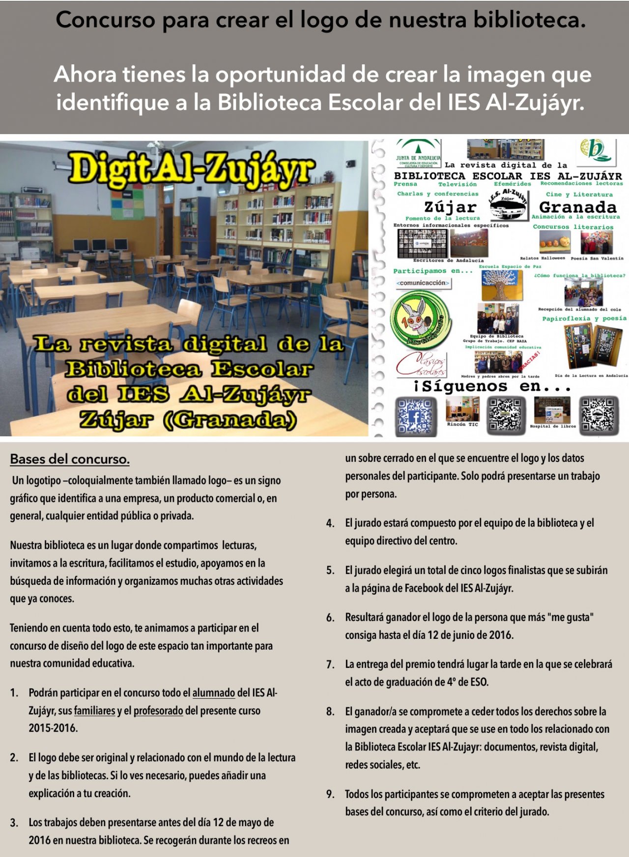 - El ganador/a se compromete a ceder todos los derechos sobre la imagen creada y aceptará que se use en todo los relacionado con la Biblioteca Escolar IES Al-Zujayr: documentos, revista digital, redes sociales, etc.